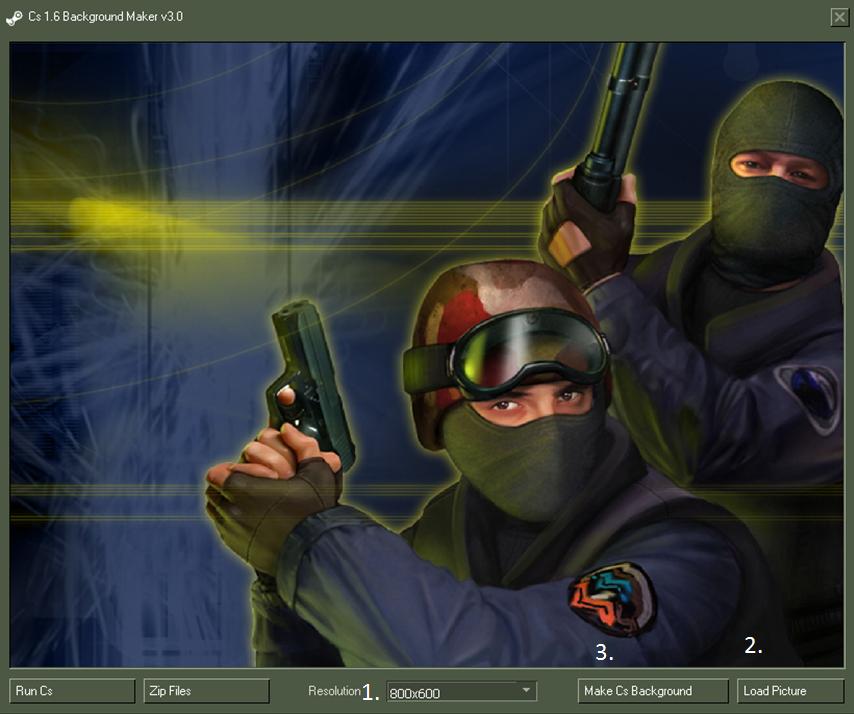 V tomto programe sa bude editovat farebná schéma GUI. Po spustení nám vyskočí rovnaké okno, ako keď sme prvý raz spustili CS Background theme maker. Tento program nám ponúka možnosť si upraviť celé menu v CS 1.6 (od schémy, keď hru spustíme až po úpravu tabuľky na skóre)